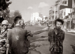 A gun. A man. A Vietnam officer. An execution. A bullet. A war. A soldier. A lot of blood on the ground and a corpse.